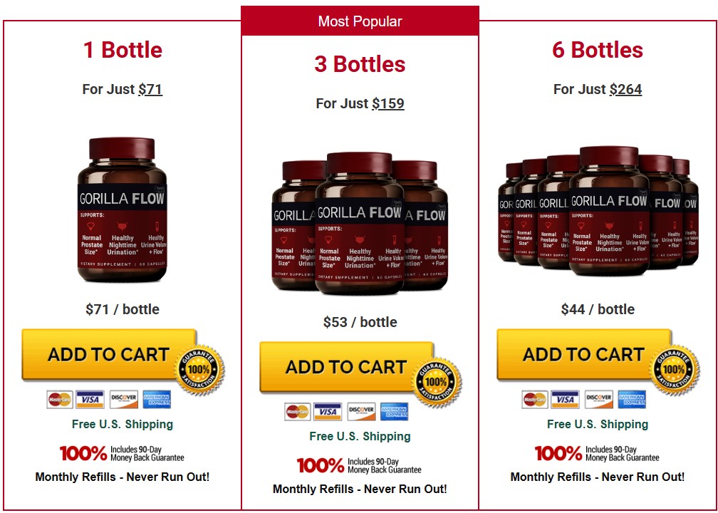 The Gorilla Flow Prostate Formula is offered in its straightforward pill format, and these pills are readily available for use and can effectively enhance penis size. Thus, you can order and make a purchase for it. Therefore, endeavor to locate an official website and ensure it is legitimate and not a scam. Therefore, acquire a container of 30 pills, and take advantage of Gorilla male enhancement pill offerings to achieve your desired penis size.